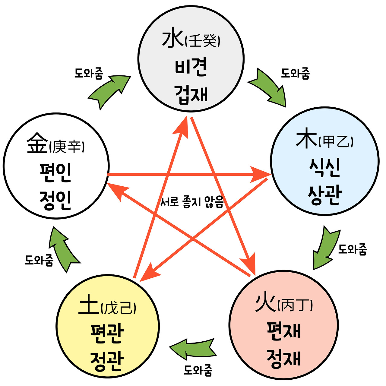 👉십성(비견, 겁재, 정재, 편재, 식신, 상관, 편인, 정인, 정관, 편관)의 조합으로 알 수 있음.