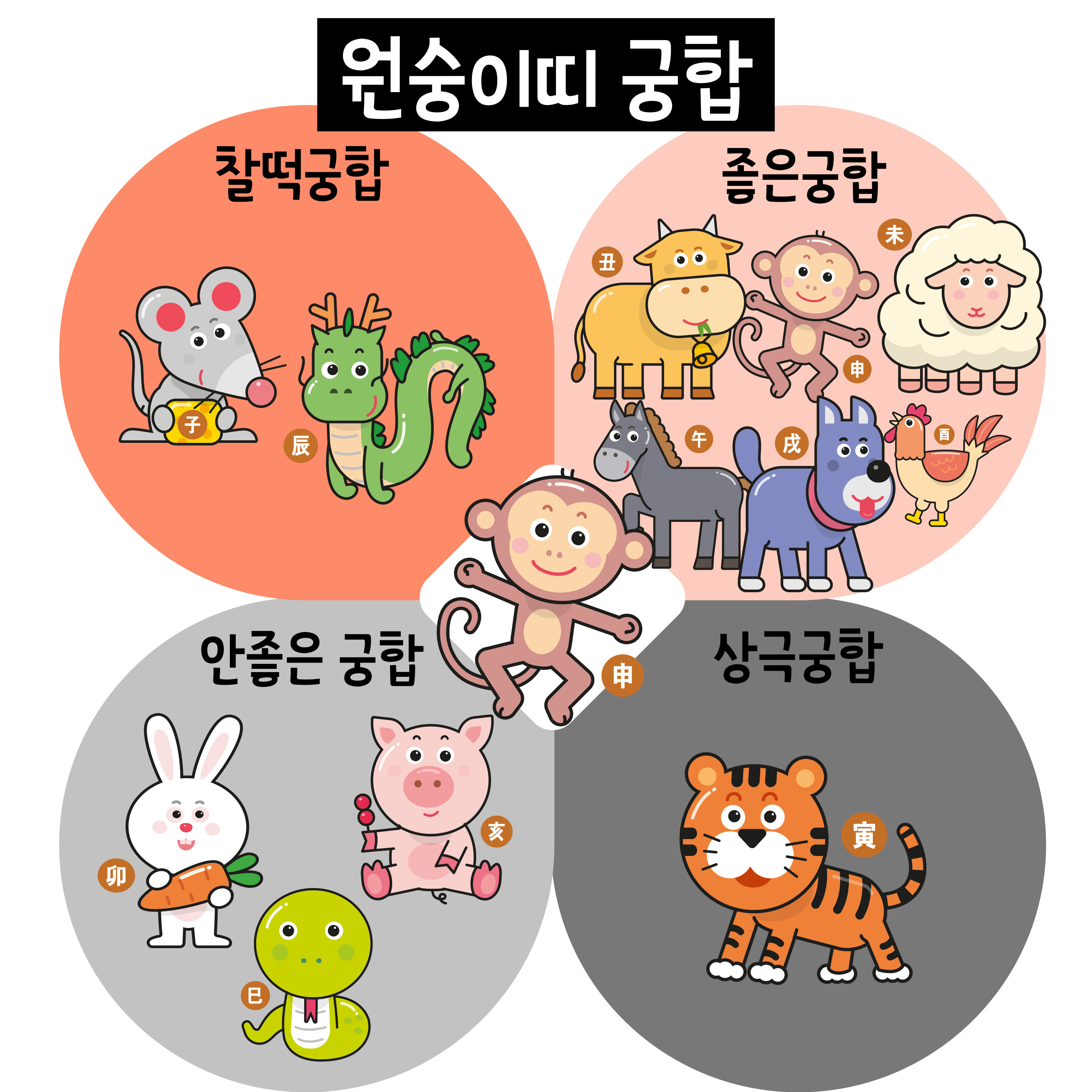 | 원숭이 | 쥐, 용 | 소, 말, 양, 원숭이, 닭, 개 | 토끼, 뱀, 돼지 | 호랑이 |