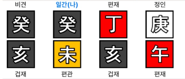 우선 이 빨간색 안에 있는 글자를 위에는 일간이라고 하고