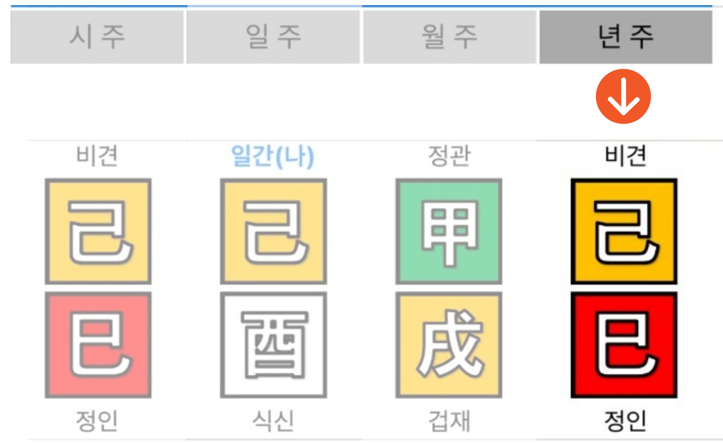 사주로 좋은 궁합이란?사주에는 5가지 성질로 사람을 나눕니다.木, 火, 土, 金, 水만세력 어플을 통해 내 사주를 입력하면이렇게 사주팔자가 나오게 되는데이렇게 색깔이 알록달록하게 나와요.