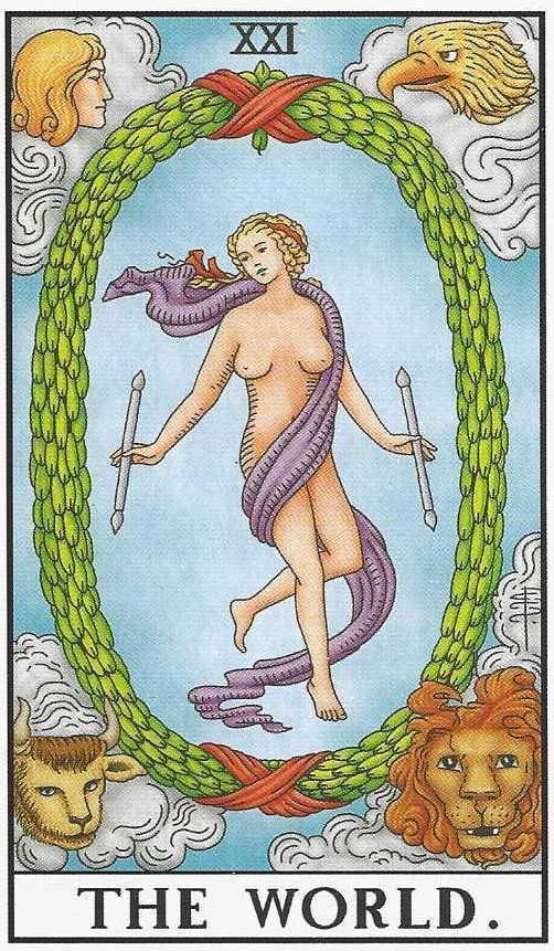 | 카드 해석 | 메이저 카드의 마지막장인 세계카드는 마지막을 의미하는 것보다는 새로운 시작을 더 강하게 내포하고 있습니다. 계절로 따지면 봄을 말하고 성스럽고 희망적인 뜻을 가지고 있어요. 나 자신을 잘 돌아보고 정확하게 판단을 한 사람은 내가 발전하여 더 앞으로 나아갈 수 있는 세상을 열 수 있다는 의미입니다. 카드를 보면 4개의 귀퉁이에는 천사와 독수리, 황소와 사자가 있습니다. 이 4요소는 10번 카드에서 책을 읽고 있는 모습으로 등장을 했었던 요소들인데 현재는 책을 읽지 않고 머리만 구름에 그려져 있습니다. 완성이 되었다라는 뜻을 내포하고 있어요. 모든것이 완성되고 제자리에 위치해 있다고 말합니다. 월계관은 승리와 명예를 뜻하는데 그 안에 위치한 여성은 다리를 숫자 4처럼 꼬고 있는데 불교에서 만을 뜻하는 모양이기도 해요. 이는 생명의 윤회와 재생을 상징하기도 합니다. 이 카드는 화합의 뜻을 많이 담고 있는데 여성이 들고 있는 봉의 갯수도 2개인 만큼 혼자서 해결하는 것보다 함께 이루어내는 것이 더 강하게 완성되고 조화롭게 어우러진다는 것을 상징합니다. 그리고 이 카드는 해외의 의미를 강하게 내포하고 있어서 질문에 대한 해석이 해외쪽으로 많이 됩니다. 해외가 뜻하는 바는 내가 여태껏 경험하지 못한 나에게는 새로운 도전과도 같은 의미가 있습니다. |