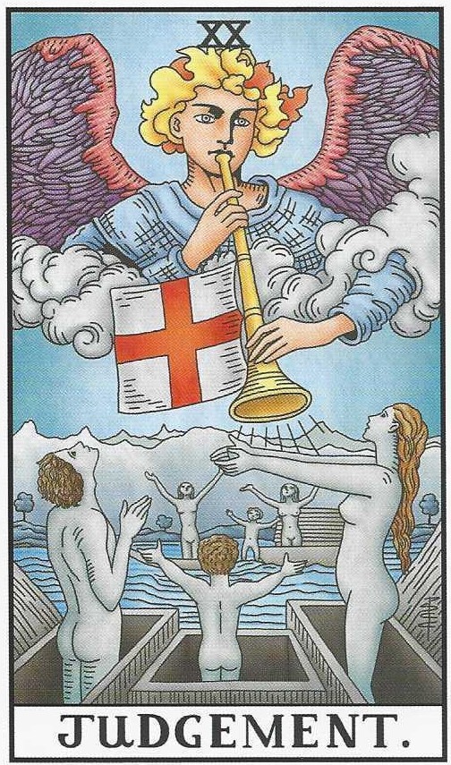 | 카드 해석 | 죽은 망자들을 심판하기 위해 천사가 나팔을 불고 있고 그 소리를 듣고 모두 관에서 일어나 천사를 맞이하고 있습니다. 그동안의 내 노력이 얼마만큼의 가치였는지를 심판받게 되는 카드라고 할 수 있습니다. 내가 후회하지 않을 만큼 노력을 했다면 천국으로 향하겠죠. 이 카드는 사실 어떤것이든 두번째가 조금 더 희망적이고 좋다라는 해석이 있어요. 대학시험을 보는 것도, 공무원 시험에서도 첫번째에 되기 보다는 두번째, 세번째에 된다는 카드이고 대학에 떨어져 재수를 하게 되면 그 전보다 더 좋은 대학에 지원하더라도 붙을 수 있는 카드입니다. 그림의 배경을 보면 망자들이 있는 곳은 물입니다. 수장을 한 것 처럼 모두 물에 떠있어요. 물은 카드에서 내면, 심리적, 영적요소 등을 뜻해요. 그래서 이 심판은 내 속 안의 영혼을 심판하는 것이라고 생각하시면 됩니다. 그동안 노력을 많이 했다면 내가 스트레스 받고 힘들어 하던일이 드디어 해소된다는 카드이기도 해요. 그리고 몸의 건강상태나 나의 환경이 아울러 더 좋아진다는 것을 뜻합니다. |