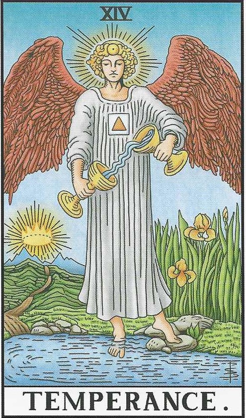 | 카드 의미 | 이 카드는 균형과 절제를 뜻하는 카드입니다. 느슨해진 삶을 다시 정신을 차리고 바라보라는 경고를 말해요. 그림에서도 나타나듯이 멀고 험한 길이 보이고 그 길에 끝에는 왕관모양의 빛이 있어요. 이겨내야하는 길이 멀고 험난한 것을 뜻하는데 붉은 날개의 열정을 가진 천사가 컵의 물을 나누고 있는데 눈을 감고 있죠. 보이는 것만 판단하는 것이 아닌 정확하게 느끼고 깨달음을 얻기 위해 절제가 중요하고 필요하다는 것을 의미합니다. 일을 해결하는데 있어서 조바심 낼것도 없고 걱정할 것도 없어요. 침착하고 평온하게 적당한 위치를 파악해야 옳은 선택을 할 수 있습니다. 한 쪽 발만 담그는 행동, 네모안에 세모가 그려진 것 모두 균형을 잡기 위해 노력해야한다는 것을 말합니다. 어느 순간부터 막나가거나 고삐 풀렸네 라는 생각을 하게 된다면 다시 눈을 크게 뜨고 마음을 다잡아야 한다는 것을 경고해주는 카드입니다. 결론적으로 봤을때에는 후광이 비치는 저 천사처럼 자신의 열정으로 정신적 승리를 이루게 되니 열심히 노력하시면 좋은 결과를 얻게 되고 답을 구하게 될 것입니다. |