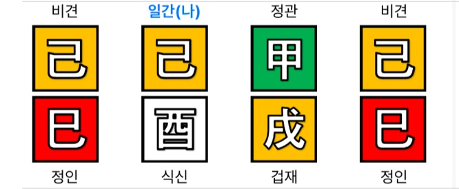 왜냐하면 바로 윗줄에 두번째 글자 일간(나)라고 적혀있는 곳이 바로 비견입니다.